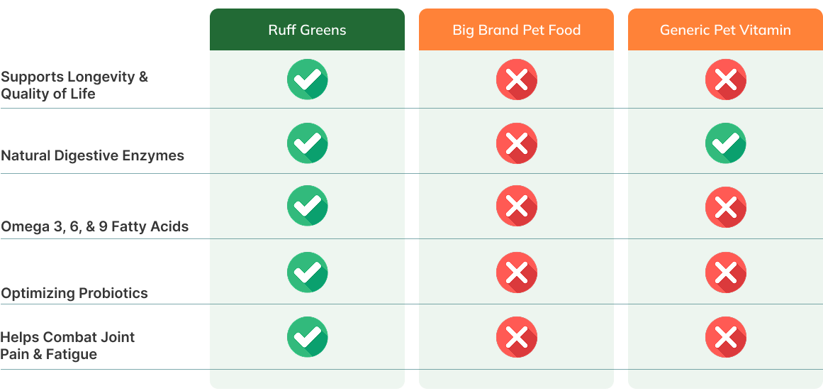 It’s DEAD FOOD. That's where Ruff Greens comes in. With a blend of live probiotics, omega oils, antioxidants, and essential vitamins, Ruff Greens supports your dog's immune system and overall health, helping them live their best lives for years to come.