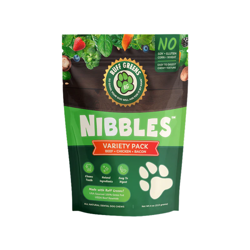 Ruff Nibbles are delicious, all-natural beef rawhide chews designed to satisfy your dog’s natural craving for taste and texture. Unlike ordinary chews, Ruff Nibbles are infused with the essential vitamins, minerals, probiotics, and superfoods found in Ruff Greens VitaSmart, so every bite delivers both enjoyment and nutrition.